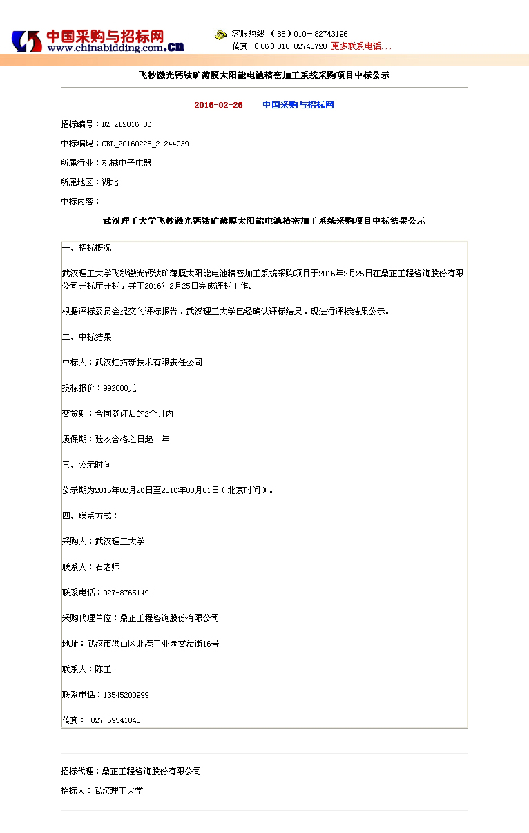 飛秒激光鈣鈦礦薄膜太陽(yáng)能電池精密加工系統(tǒng)采購(gòu)項(xiàng)目中標(biāo)公示