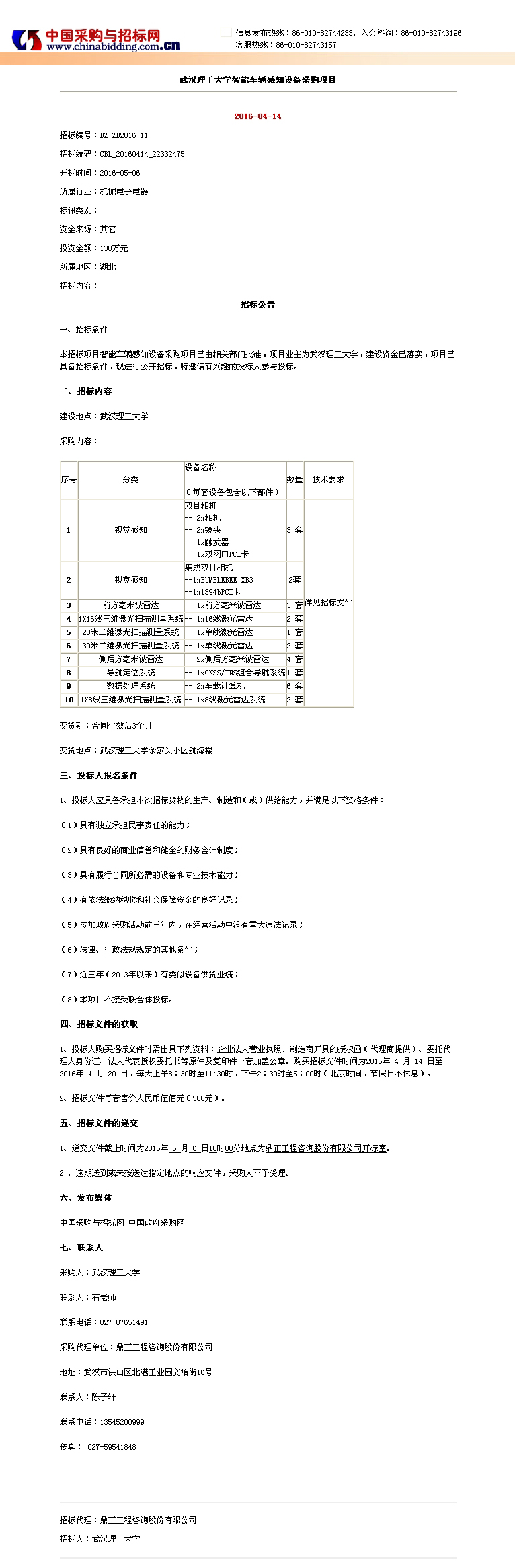 武漢理工大學智能車輛感知設備采購項目招標公告