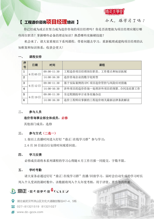 鼎正在6月份組織同事在線學(xué)習(xí)中價(jià)協(xié)舉辦的《工程造價(jià)咨詢企業(yè)項(xiàng)目經(jīng)理網(wǎng)絡(luò)直播培訓(xùn)》課程。
