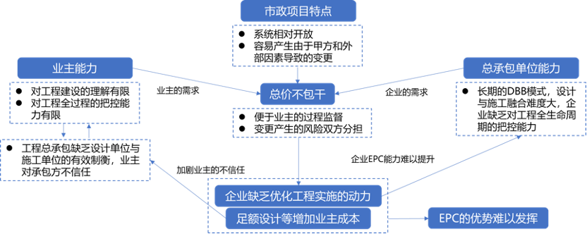 簡言之,市政項目的特點、業主和總承包單位的能力導致了市政工程項目是總價不包干的,而這使得總承包單位缺乏優化設計施工融合的動力,甚至使得總承包單位進行設計與施工的畸形融合。而這一方面使得業主對推行工程總承包興趣缺失甚至存在抵觸,對總承包單位的管理能力建設遲緩,另一方面也使得總承包單位的工程總承包能力建設推進緩慢,而這又進一步固化了總價不包干的模式,從而使得工程總承包的優勢難以發揮,由此,工程總承包推進艱難。