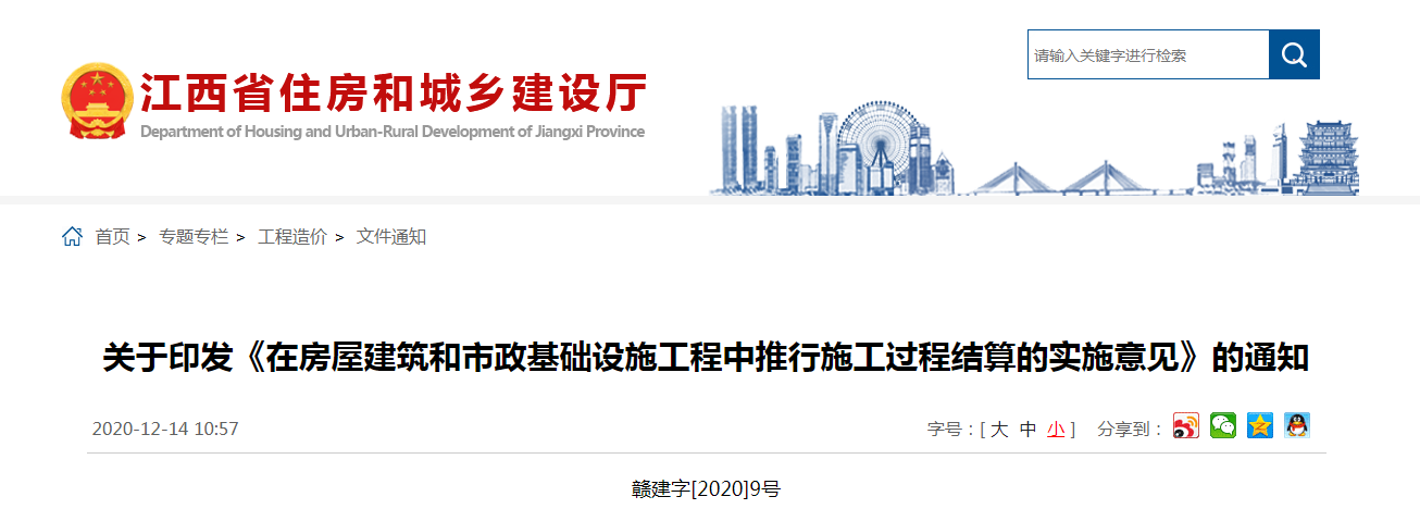 2020年12月14日,江西省住建廳發布通知,印發《在房屋建筑和市政基礎設施工程中推行施工過程結算的實施意見》,自下文之日起施行。