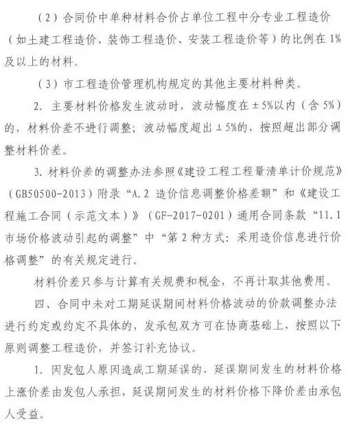 2、合同中已經采用無限風險、所有風險等表述對材料價格風險進行明確約定的,發承包雙方可在協商基礎上調整工程造價,并簽訂補充協議。調整的范圍限定于主要材料。主要材料價格發生波動時,波動幅度在±5%以內(含5%)的,材料價差不進行調整;波動幅度超出±5%的,按照超出部分調整材料價差。