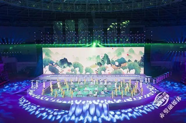 夜幕下的赤壁市體育中心場館內,燈光璀璨,五彩繽紛,美輪美奐。