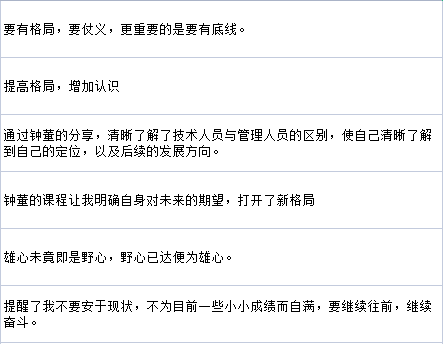 聽完鐘董的分享,鼎正工程咨詢股份有限公司董事長王雁然對此次中量鼎正EMBA的聯(lián)合開辦表示祝賀。他表示,鐘董的分享充滿激勵與鼓勵,希望學員們能夠從中學習積極追求的樂觀心態(tài),在這寶貴的一天里,主動思考、互動,在有限的時間內,創(chuàng)造無限的學習價值。
