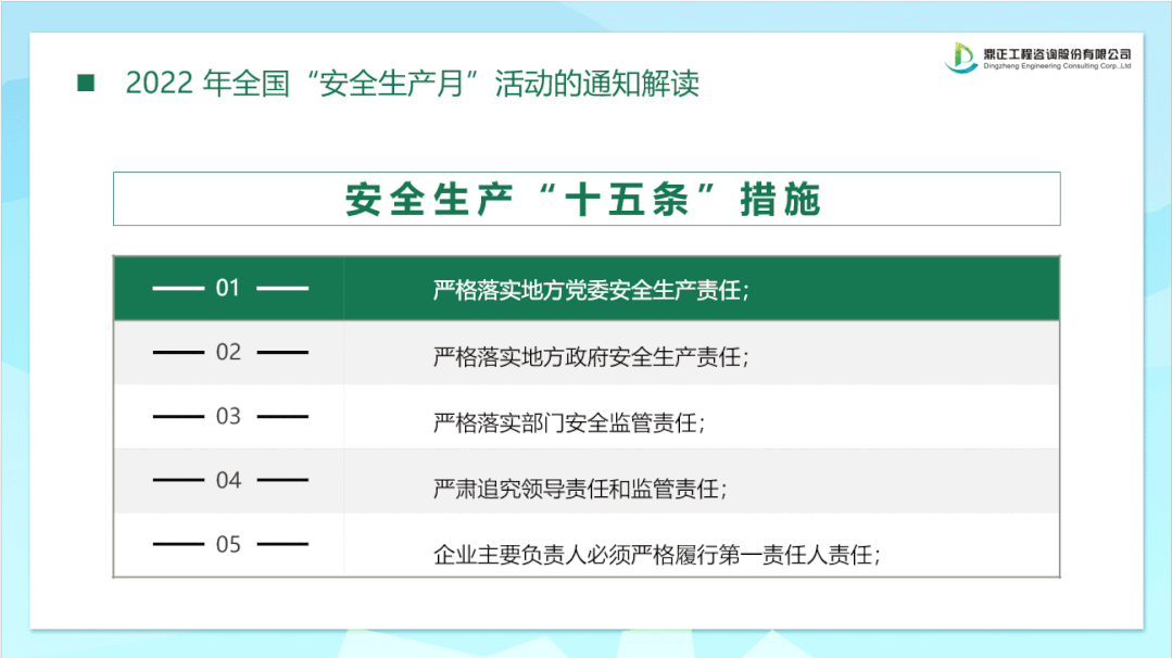 2022年全國(guó)“安全生產(chǎn)月”重點(diǎn)工作要求,1.深入學(xué)習(xí)貫徹習(xí)近平總書(shū)記關(guān)于安全生產(chǎn)重要論述,推動(dòng)落實(shí)安全生產(chǎn)十五條措施;2.宣傳貫徹安全生產(chǎn)法,推動(dòng)“第一責(zé)任人”守法履責(zé);3.持續(xù)開(kāi)展“安全生產(chǎn)萬(wàn)里行”活動(dòng),分類強(qiáng)化警示教育;4.廣泛開(kāi)展“安全宣傳咨詢?nèi)铡焙桶踩麄鳌拔暹M(jìn)”活動(dòng),提升社會(huì)公眾安全意識(shí)和自救互救能力。