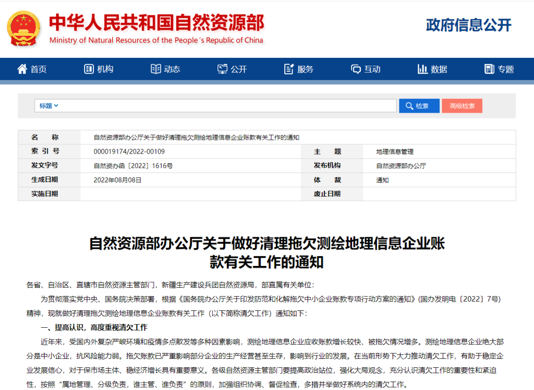 為貫徹落實黨中央、國務院決策部署,根據(jù)《國務院辦公廳關于印發(fā)防范和化解拖欠中小企業(yè)賬款專項行動方案的通知》(國辦發(fā)明電〔2022〕7號)精神,現(xiàn)就做好清理拖欠測繪地理信息企業(yè)賬款有關工作(以下簡稱清欠工作)通知如下: