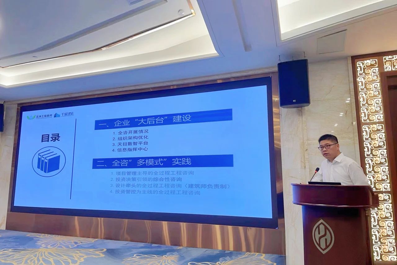 五洲工程顧問集團有限公司執行總經理柴恩海做了《全過程工程咨詢探索實踐》的主題報告,基于行業全咨標桿企業轉型發展的實際,詳細介紹了公司全咨“大后臺”建設和全咨模式的實踐兩個方面的做法和經驗,以及通過數字化平臺建設,賦能全咨業務發展,并對當前全咨發展提出了相關建議。