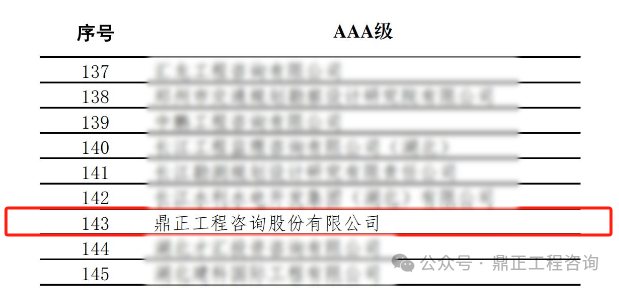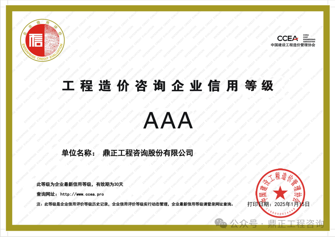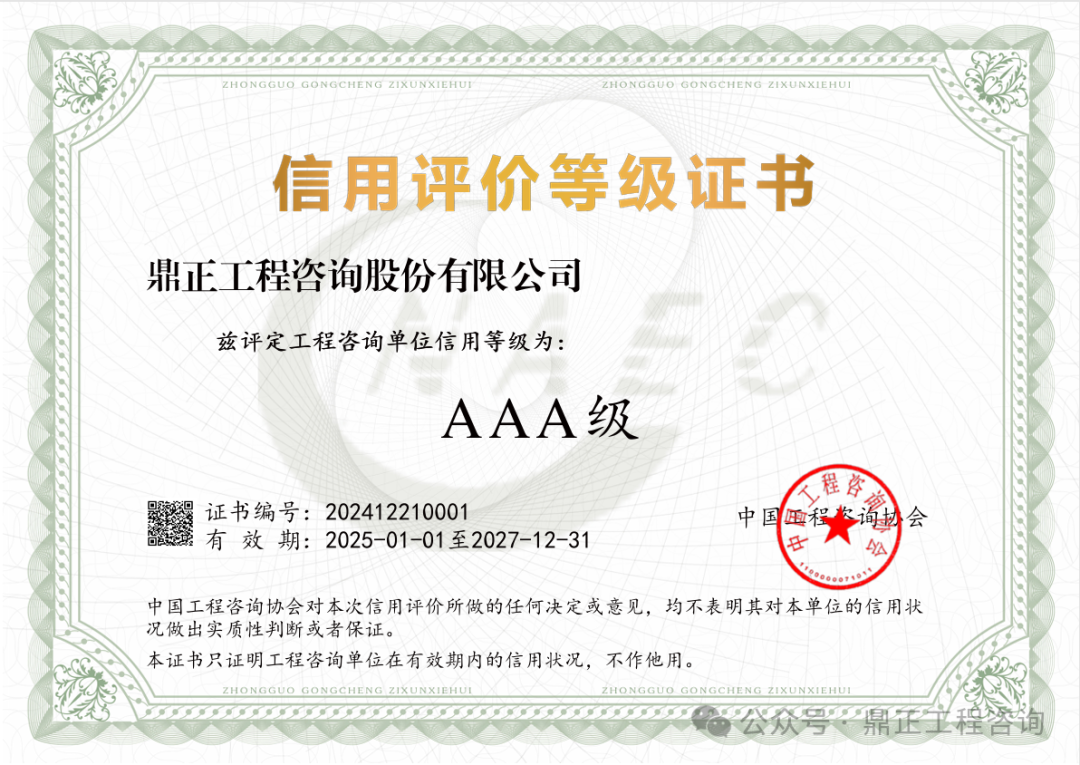 近日,中國(guó)工程咨詢協(xié)會(huì)發(fā)布了2024年度工程咨詢單位信用評(píng)價(jià)公告,鼎正憑借優(yōu)異的誠(chéng)信建設(shè)和信用管理能力,榮獲“AAA級(jí)信用等級(jí)”評(píng)價(jià)